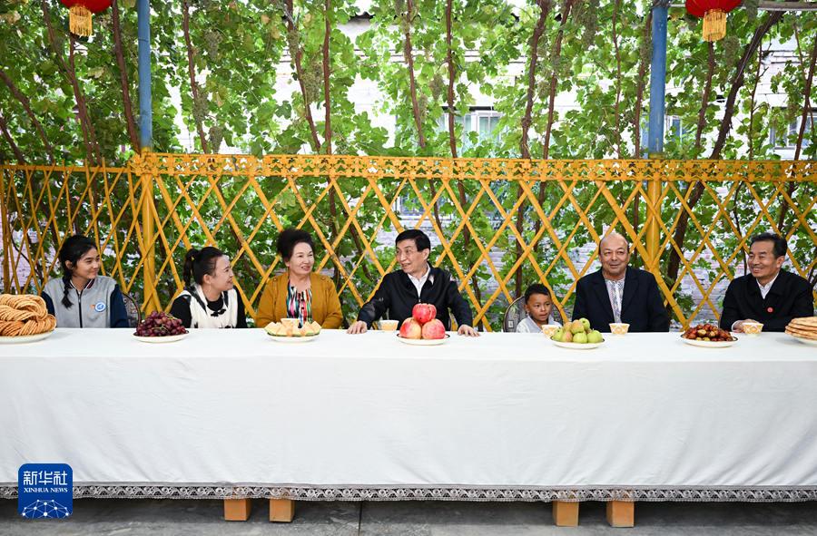 9月25日下午,受習(xí)近平總書記囑托,中共中央政治局常委、全國政協(xié)主席、中央代表團團長王滬寧帶領(lǐng)中央代表團部分成員在巴音郭楞蒙古自治州庫爾勒市看望慰問當(dāng)?shù)馗髯甯刹咳罕姟_@是王滬寧和中央代表團部分成員在庫爾勒市阿瓦提鄉(xiāng)吾夏克鐵熱克村了解鄉(xiāng)村產(chǎn)業(yè)發(fā)展和群眾生產(chǎn)生活情況。新華社記者 張領(lǐng) 攝