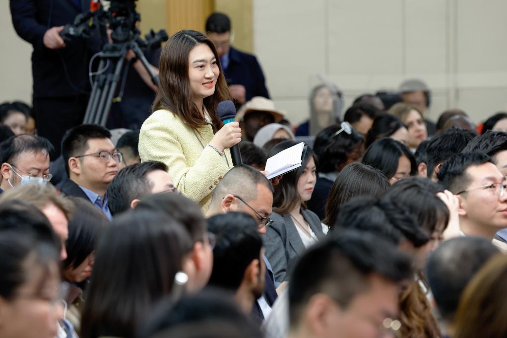 3月6日,十四屆全國人大三次會議在北京梅地亞中心新聞發布廳舉行記者會。國家發展和改革委員會主任鄭柵潔、財政部部長藍佛安、商務部部長王文濤、中國人民銀行行長潘功勝、中國證券監督管理委員會主席吳清就發展改革、財政預算、商務、金融證券等相關問題回答中外記者提問。這是新華社記者在提問。