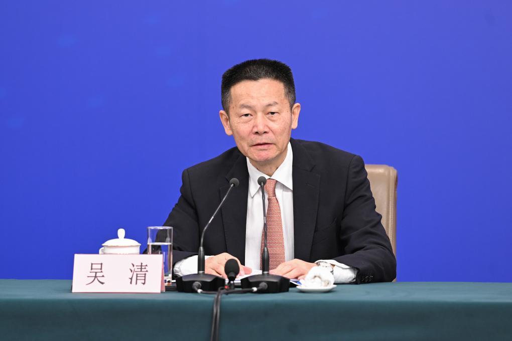 3月6日,十四屆全國人大三次會議在北京梅地亞中心新聞發布廳舉行記者會。國家發展和改革委員會主任鄭柵潔、財政部部長藍佛安、商務部部長王文濤、中國人民銀行行長潘功勝、中國證券監督管理委員會主席吳清就發展改革、財政預算、商務、金融證券等相關問題回答中外記者提問。這是吳清在回答記者提問。
