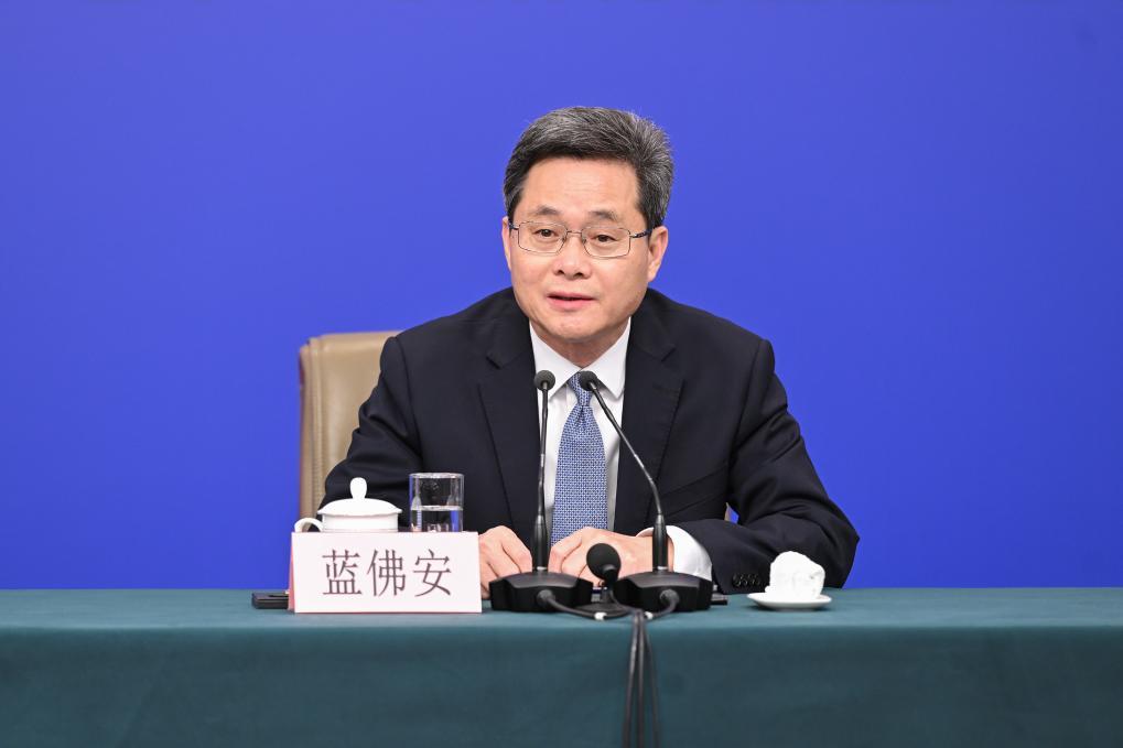 3月6日,十四屆全國人大三次會議在北京梅地亞中心新聞發布廳舉行記者會。國家發展和改革委員會主任鄭柵潔、財政部部長藍佛安、商務部部長王文濤、中國人民銀行行長潘功勝、中國證券監督管理委員會主席吳清就發展改革、財政預算、商務、金融證券等相關問題回答中外記者提問。這是藍佛安在回答記者提問。