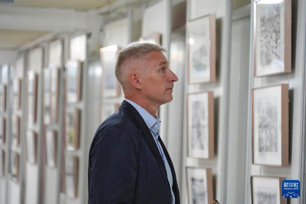 8月28日,在俄羅斯圣彼得堡,一名男子參觀紀念中國人民抗日戰爭暨世界反法西斯戰爭勝利80周年圖片展。新華社記者 周天翮 攝